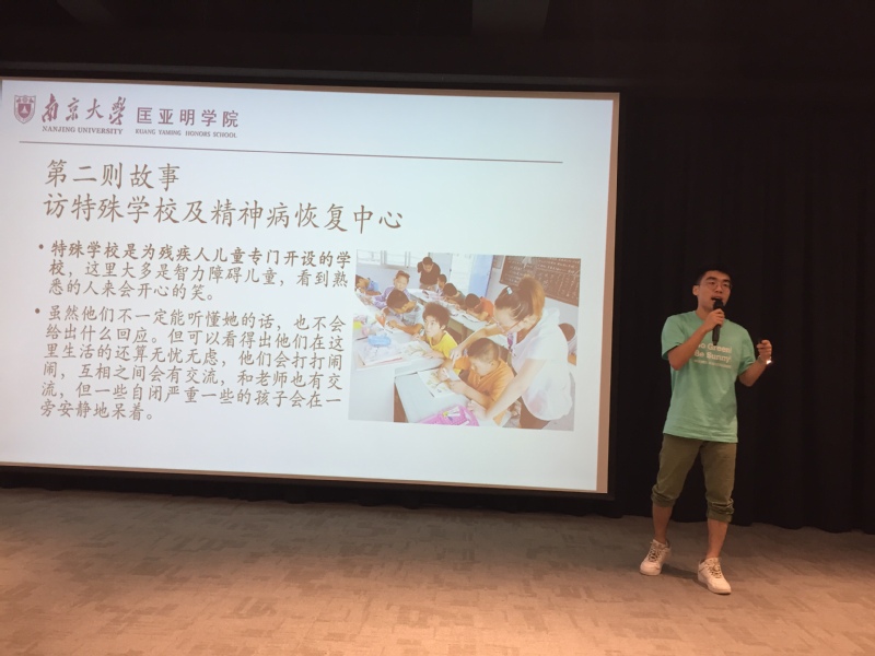 24日下午,5所院校代表分享了各自在社会精神健康发展中所做的贡献。 成人影视片 副团长帖鑫同学以“停下来,静静地听听他们的故事”为报告主题,着重介绍了两类志愿者活动:一是,南大纽·工作营;二是,访问特殊学校及精神病恢复中心。他特别提出,精神健康支持应该在群体之下,更多关注独立个人的关怀。
