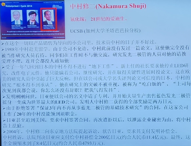 之后,万教授分享了著名物理学家中村修二的故事:讲述了一个从无人重视到诺贝尔物理学奖的故事。