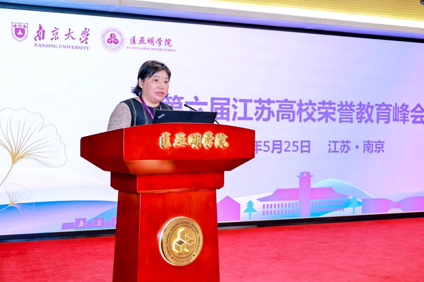 郭新宇代表江苏省教育厅对峰会的召开表示祝贺。她表示,推动荣誉教育是具有战略意义的,有利于拓宽成长路径、打破传统壁垒、建立统一标准,从而能够满足学生的个性化发展需求、促进优质资源共享、提升荣誉教育质量。她提出,鼓励荣誉学院进行“一校一策”“一生一方案”“一生一课表”“一生一项目”的探索,建立健全荣誉教育制度,完善全链条培养,为学生的成长提供更科学、更规范的保障,确保人才培养更好地对接国家战略、地方产业需求,形成特色鲜明的江苏一流本科教育品牌效应,在全国范围内树立标杆。