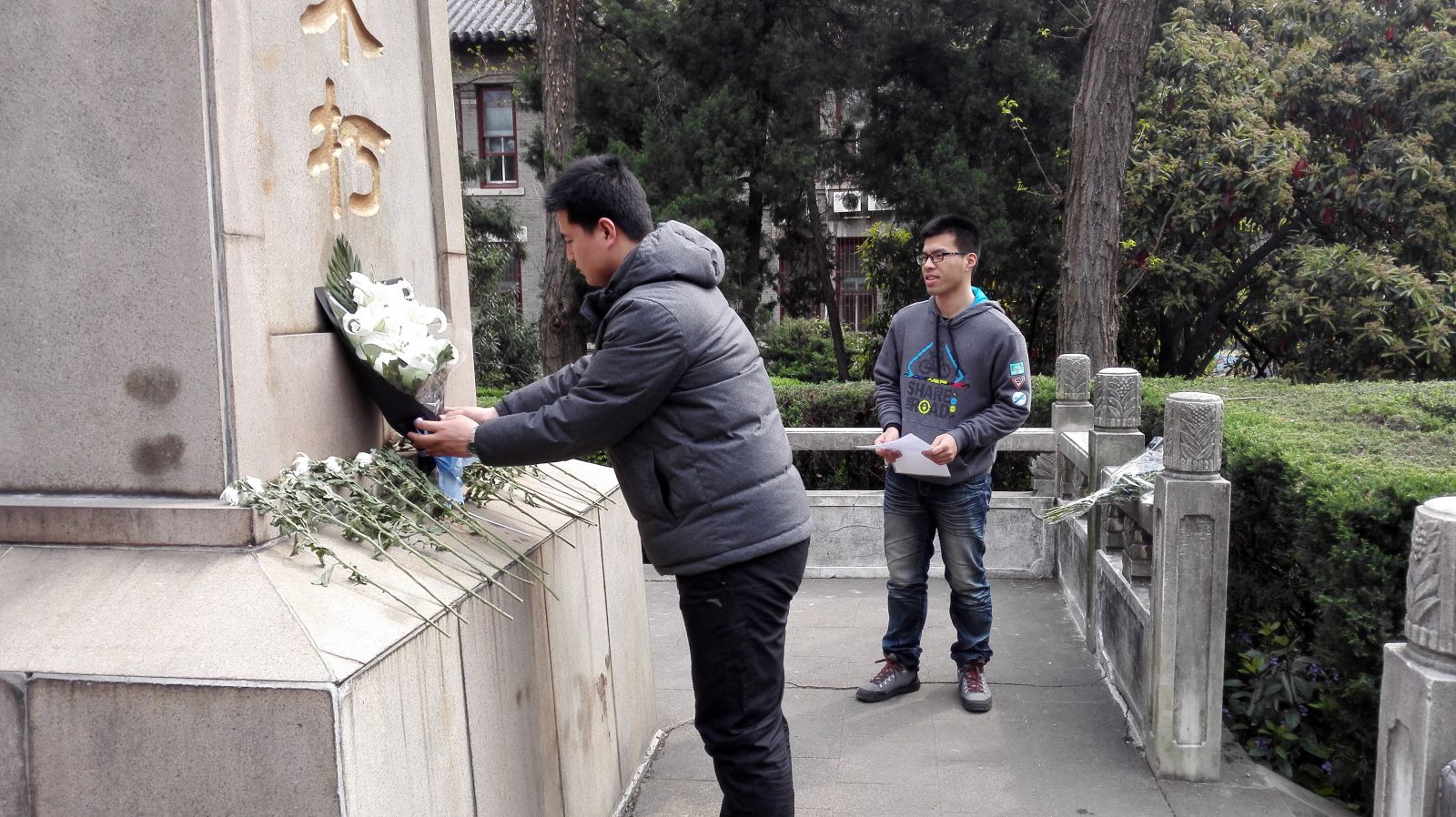在庄严肃穆的国际歌声中,党员代表吴晗向烈士纪念碑敬献鲜花,并三鞠躬以致哀,而后由党员代表马超致悼词,默哀一分钟。