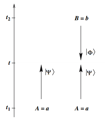 事实上,在传统的量子力学体系中,任何一个时刻t的量子态是由在t以前的时间某个时间点t1<t时刻的量子态以及体系在t1之后的演化决定的。但是如果我们知道t2>t时刻的量子态,我们也可以通过t到t2这段时间内量子体系的演化倒推出t时刻的量子态。在没有量子测量的情况下,两种方法得到的结果应当是相同的。但是假如在t2时刻恰好进行了一次量子测量,倒推出的t时刻量子态将和传统定义的量子态不同。我们把它称作“过去的量子态”。