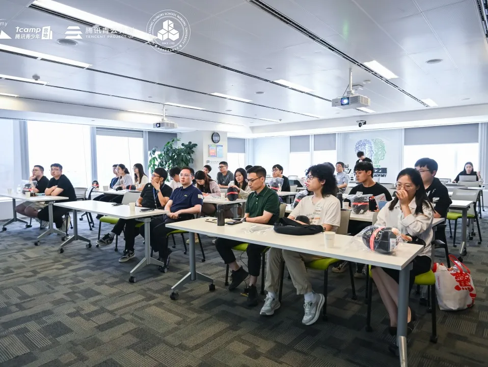 随后的课堂学习部分内容丰富。资深讲师张厚望带来了《腾讯的8个产品理念》课程,核心强调“一切以用户为本”,并深入讲解了“内部三角”(定位、需求、匠心)和“外延四要素”(时机、危机、商业、合作)。混元3D创作引擎技术负责人刘思聪则分享了突破性的《混元3D生成大模型》,展示了仅需文本或图片描述即可一键生成可交互3D场景的能力,预示着3D创作的大众化趋势。郑宇老师在《大模型浪潮》课程中解读了腾讯的AI战略布局,包括对算力基建、高质量数据和顶尖人才的投入,并通过AI生成音色等应用让同学们感受到生成式AI的巨大潜力。