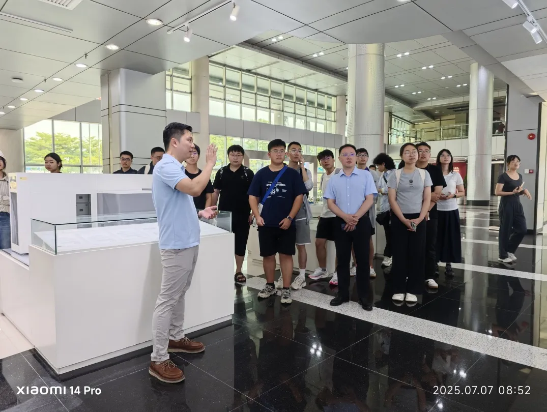 7月10日下午,调研团队转赴深圳大学高等研究院。座谈会上,深大对南大匡院等师生的到访表示热烈欢迎,两校学生代表依次介绍各自培养方案与学习体会:深大同学聚焦交叉创新平台与产业协同育人,匡院同学则阐述“大理科”贯通式、个性化培养路径。双方围绕课程设置、科研训练、国际交流等议题坦诚交流,会场气氛活跃。随后,师生共同参观深大校史馆,从“特区大学、窗口大学、实验大学”的办学定位,到校地共建、资金政策持续投入所催生的高速成长,深刻感受深圳高等教育与城市发展同频共振的澎湃动力。
