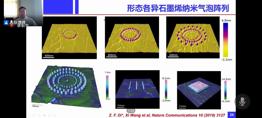 在第二部分,狄老师讲解了异质界面的新奇物理现象,包括石墨烯纳米气泡阵列,石墨烯纳米气泡赝磁场物理特性等等。