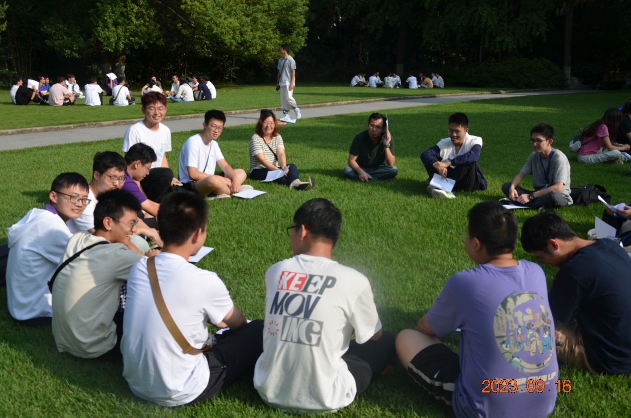 所有新生与老师分为数组团坐在北大楼前草坪,沐浴在温暖的阳光下,,轮流用两句真话和一句假话描述自己,其他的同学和老师猜测哪一句是假话,大家各方面的描述在增添乐趣、活跃气氛的同时也增进了彼此间的了解、拉近了彼此的距离。随后大家经过一轮轮的增加细节,给身边的每个人都画了一幅速写作为赠与彼此的礼物。