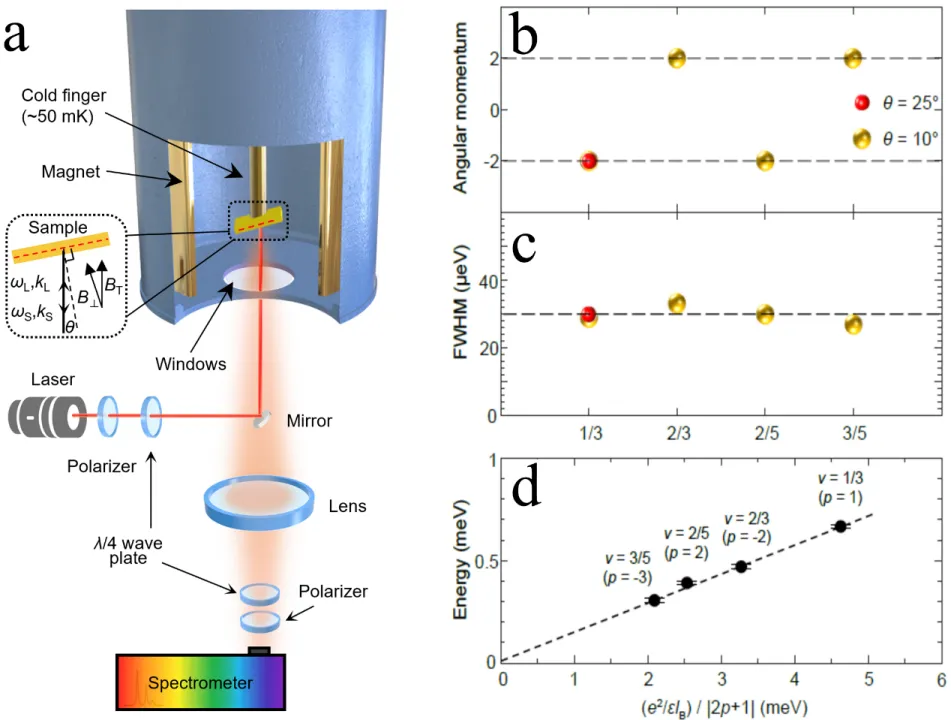 对于该实验测量,无论是从实验技术,还是从基础物理创新角度,都意味着是0到1的突破。杜灵杰带领团队,花费数年时间,通过精妙的设计将看似矛盾的测量要求一一实现,在成人影视片 自主设计、集成组装了一台根植于He3-He4稀释制冷技术的极低温强磁场共振非弹性偏振光散射系统(图3a)。这一特殊的“望远镜”有两层楼高,可以在零下273.1度下捕捉到最低达10GHz的微弱激发并判断其自旋。测试表明,这一技术的相关测量参数达到国际领先水平,为引力子激发的测量奠定了实验基础。依靠这一利器,实验团队在砷化镓半导体量子阱中成功观测到分数量子霍尔效应引力子,取得重要突破。团队通过共振非弹性光散射测量到了最低能量长波集体激发,并通过改变入射和散射光的自旋,观察到该激发具有自旋2的特性且是手性的(图3b)。并且测量到的极小激发峰宽符合动量守恒下引力子激发的长波特性(图3c),而测到的能量在m/n分数态正比于Ec/n(Ec为库伦能),符合其能量特性(图3d)。这些结果从自旋,动量和能量角度充分提供了引力子激发的实验证据。
