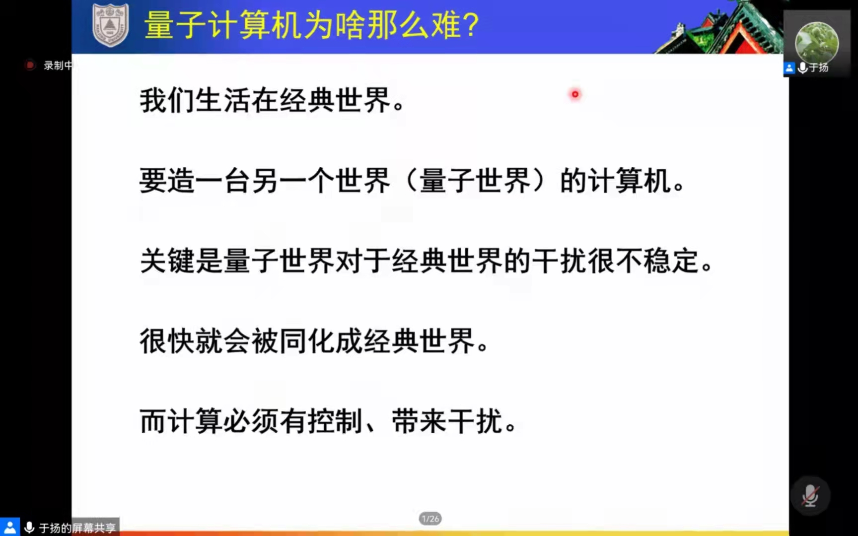 2.  于教授提出量子信息处理这一重大课题,为我们讲解量子通信、量子精密测量、专用量子计算机与通用量子计算机四大应用领域内目前的科研成果与仍面临的应用、技术问题。