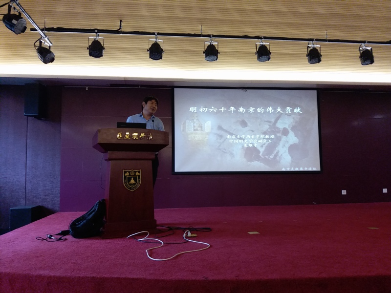 南京在明朝时期,尤其是明初的60年间,经济、文化发展很快,成为全国最大的城市。“南京”名称也始于明代。历史上先后称为冶城、越城、金陵、秣陵、石头城、建业、建康、白下、上元、升州、江宁、集庆、应天、天京等,尽管几番更换城名,依然以其悠久的历史、灿烂的文化、雄奇的丰姿、绮丽的风光,盛名百世,在中华民族发展史上占有重要的地位。朱元璋称帝的前两年,即公元1366年就下令新建宫城和改筑应天府城。历时21年之久,筑成号称方圆96里,实测为33.676公里的砖城。 南京城在现存的古城垣中,不仅是我国第一而且是世界之最。明代南京皇宫位于城的东部,建筑宏伟壮丽。曾为明初洪武、建文、永乐三代皇帝所使用。明成祖迁都北京,建造北京皇宫时,就是以南京皇宫为蓝图的。明代南京的建筑业和造船业是两项规模巨大的官营手工业。明代南京的雕版印刷业亦闻名全国。讲座的过程中,夏教授层层递进,语言生动。夏教授首先介绍了南京的历史沿革,再由浅入深讲到了明朝的建立,之后又向同学们介绍了明朝的政治、经济发展过程。讲座快要结束之时,同学们对夏教授所讲的内容还意犹未尽,就讲座的内容与夏老师进行交流。