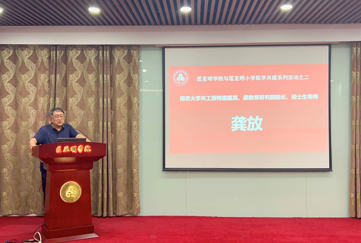 王骏在欢迎辞中对匡亚明小学师生的到来表示热烈欢迎,并感谢学校关工委对活动的积极支持和指导。他表示,在“六一”儿童节即将到来之际,从青春活泼的小学生到精神矍铄的老教授,几代人欢聚一堂共话成长非常有意义,不仅是大手牵小手的共同成长,更是对匡老的革命风骨、教育理念、学术思想的脉脉相传。希望此次活动能够帮助小学生开拓视野,激发学习动力,树立远大理想,不断奋进新征程;也希望匡院与匡小在匡老为国育才思想的指引下,常交流多合作,携手奋进新征程,为教育事业贡献力量。