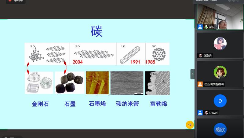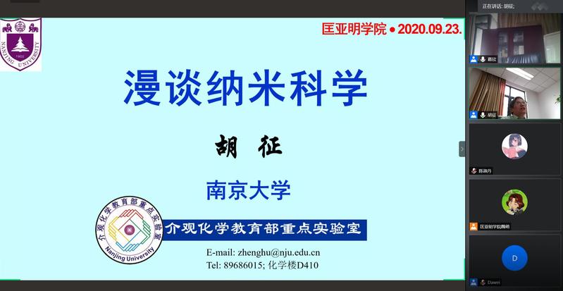 9月23日下午,介观化学重点实验室的胡征教授给成人影视片 的同学带来以“漫谈纳米科学”为主题的线上名师讲座。围绕纳米材料发展进程,介绍了他和研究团队在纳米碳材料领域做出的创新型工作;通过具体的例子和心路历程,让同学们认识纳米材料,感受科研的思维、方法、精神及其与科学知识的联系。