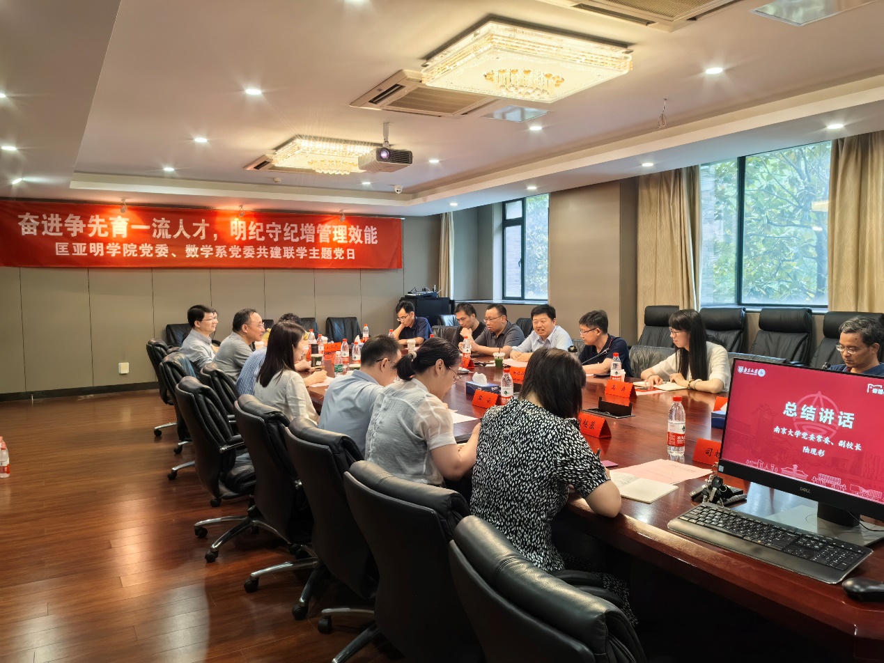 刘公祥介绍了数学系党委在强化党纪学习教育、推进党建与业务高质量融合的工作举措。他谈到,数学系党委通过邀请理论名师讲党课、与省农科院等校外科研单位共建等,提升党建活动的育人实效。今后工作中,将进一步发挥党委的政治功能,引育更多人才,为南大拔尖创新人才培养贡献基础学科的育人力量。