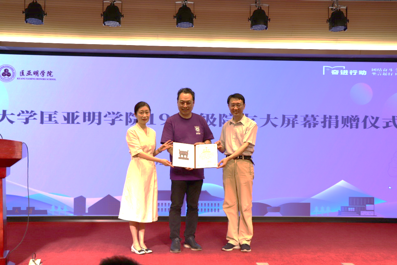 王骏、周媛向院友代表洪浩颁发感谢状。院友代表共同上台,为大屏幕揭幕。