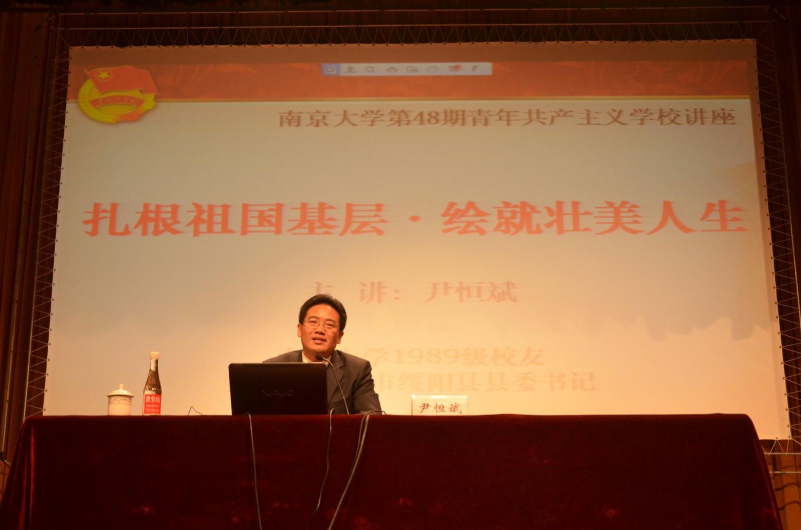 2013年11月3日,经成人影视片 团委和成人影视片 邀请,贵州省绥阳县委书记尹恒斌来到南大仙林校区。尹恒斌书记曾为成人影视片 (强化部89级文科班)系友,此次回到母校,为成人影视片 第48期青年共产主义学校的同学们带来了一场题为“扎根祖国基层绘就壮美人生”的精彩报告,他向同学们讲述了自己在南大的学习成长经历以及毕业后的工作历程,让同学们如沐春风,真切领略到了一名毕业南大,走向社会的优秀共产党员的风采。