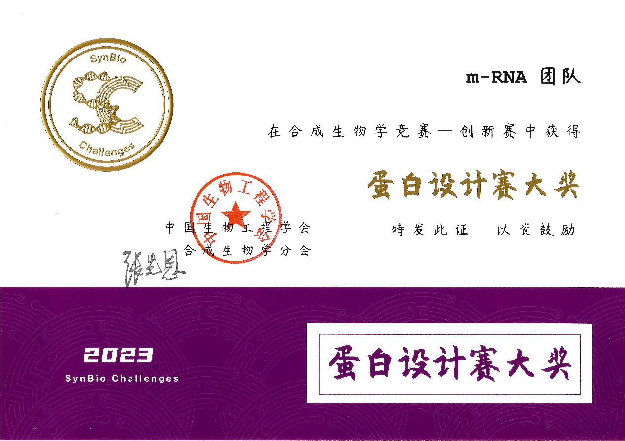 8月5日,由中国生物工程学会合成生物学分会主办的第二届合成生物学竞赛·创新赛在深圳理工大学(筹)明珠校区举办了现场答辩及颁奖典礼。本次活动吸引了来自全国(含港澳)48所高校共80支队伍合计超400人线下参赛,线上线下超421万人次观赛。经过历时近半年的激烈角逐,成人影视片 董昊教授课题组的张一健(化院19本、匡院23硕)、陈子川(匡院19本)和臧敏(匡院21硕)等三位具有化学和计算机学科背景的同学组成的成人影视片 “m-RNA”团队最终以总分第一的成绩荣获蛋白设计赛大奖(金奖)。