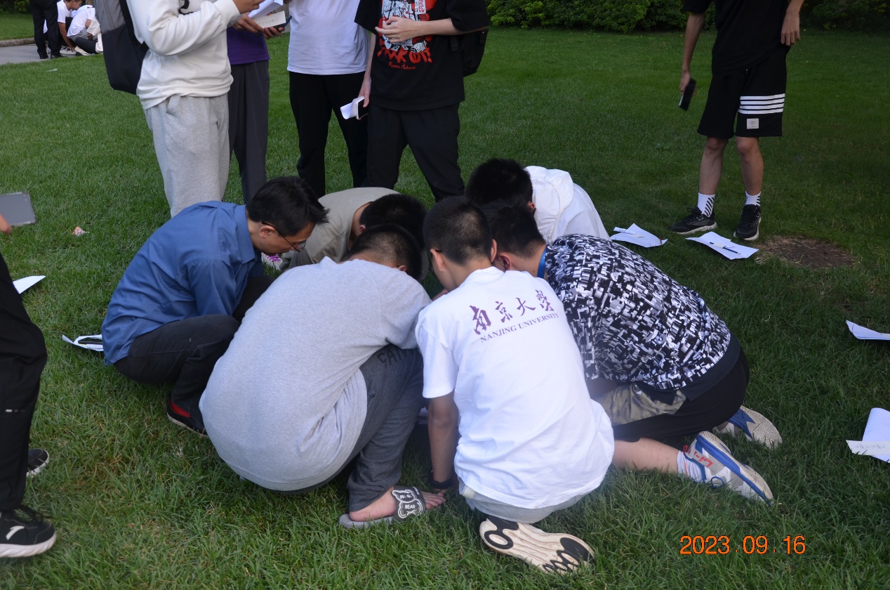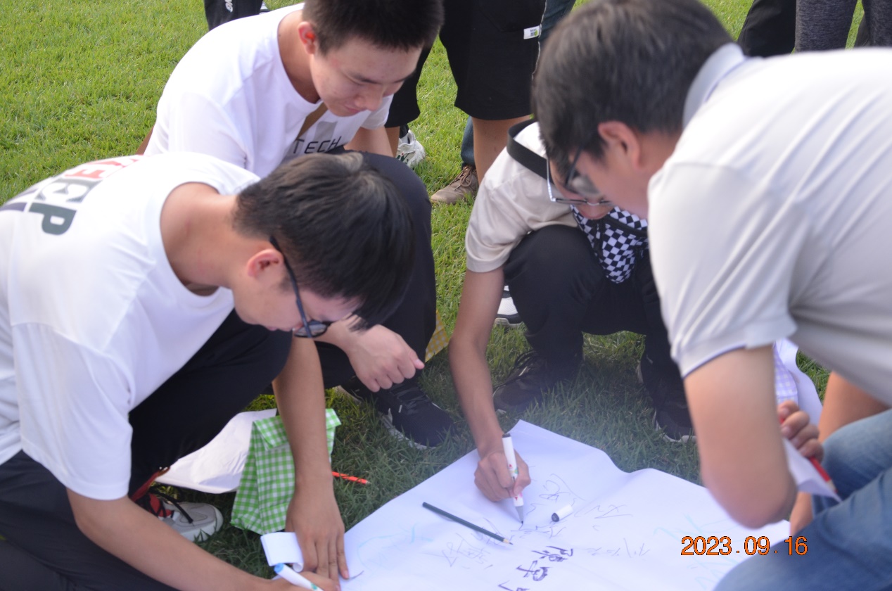 所有新生与老师分为数组团坐在北大楼前草坪,沐浴在温暖的阳光下,,轮流用两句真话和一句假话描述自己,其他的同学和老师猜测哪一句是假话,大家各方面的描述在增添乐趣、活跃气氛的同时也增进了彼此间的了解、拉近了彼此的距离。随后大家经过一轮轮的增加细节,给身边的每个人都画了一幅速写作为赠与彼此的礼物。