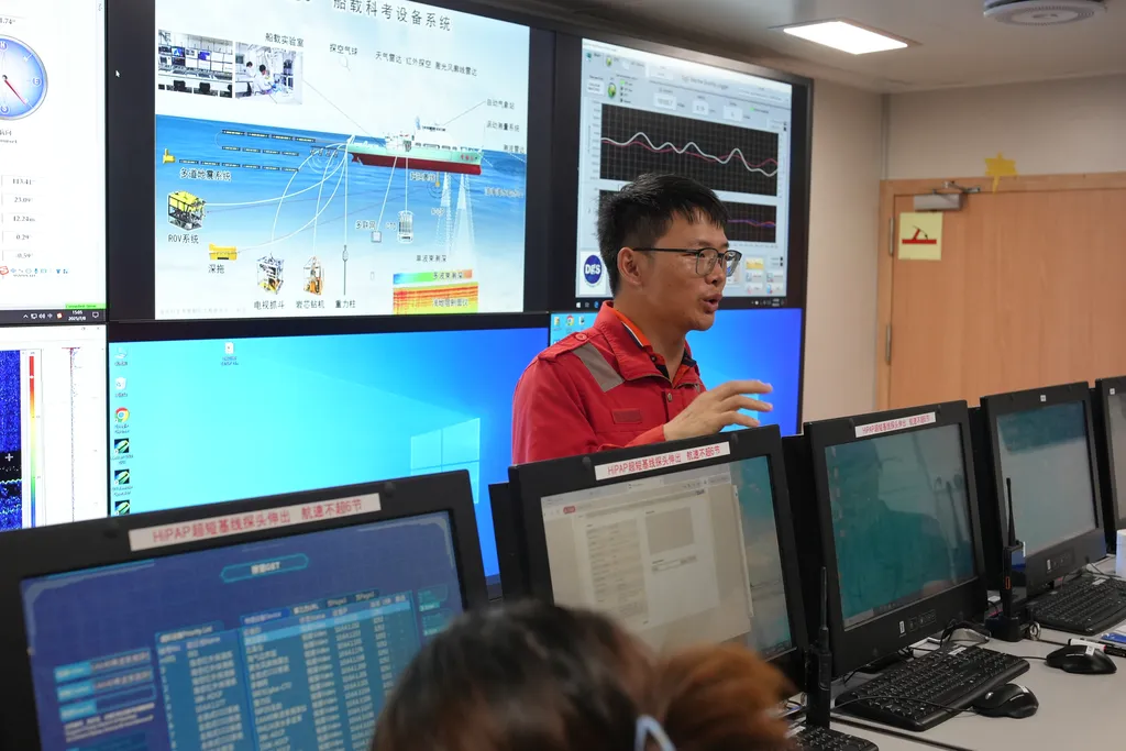 7月8日下午,调研团队的师生们登上“实验6”号进行参观。工程技术人员首先于甲板上介绍了“实验6”多学科科考使命及船载设备体系:全海深多波束测深系统、万米CTD绞车、海洋重力仪等关键装备一一亮相;随后深入湿、干实验室,现场演示数据实时采集与岸基同步回传流程。大副带领师生们走进驾驶室,详细解读动力定位仪表盘、雷达及电子海图操作要点,并回答同学们关于远洋航行安全与应急保障的问题。整场参观约90分钟,师生们意犹未尽,零距离地感受了国家海洋科考的严谨与豪迈。