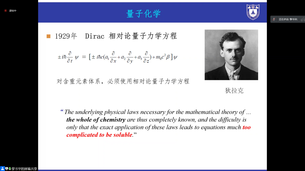 第四部分,黎教授向我们介绍了量子化学的现状:量子化学正值时代,但仍有困难,还需要年轻一代的科学家们投身努力