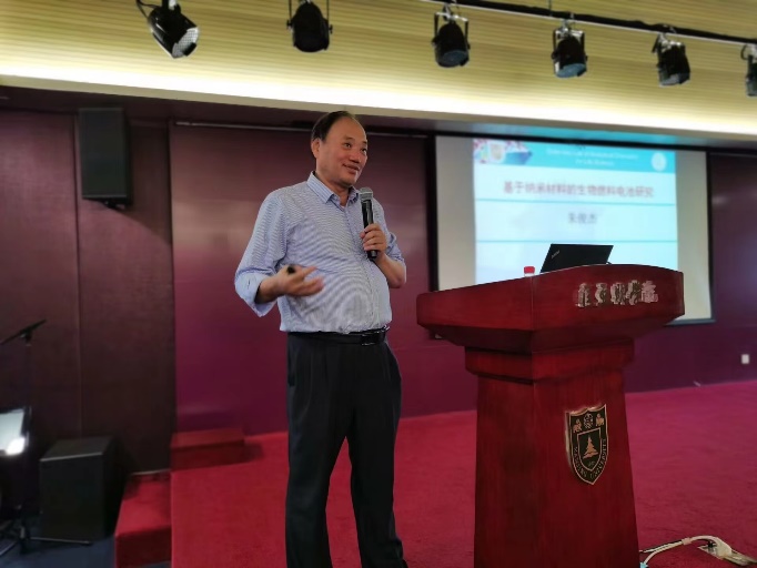 朱教授从我们都高中所熟悉的化学电池讲起。化学电池的基本原理是,借助阴阳极的电势差,使得自由电子定向移动,从而将储存的化学能转化为电能。而这个过程中,催化剂往往是必不可少的。而微生物燃料电池便是将微生物作为催化剂,在阳极室厌氧环境下,有机物在微生物作用下分解并释放出电子和质子,传递到阴极形成电流。微生物电池将底物直接转化为电能,保证了具有高的能量转化效率。朱教授所研究的生物燃料电池是借助了纳米材料的特殊性质,实现了比常规电池更高的效率。